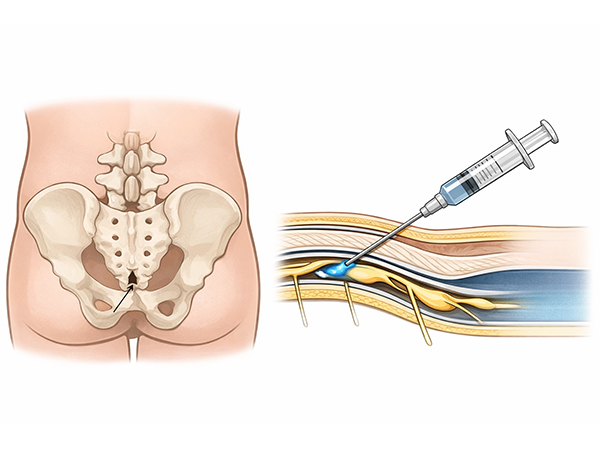 仙骨硬膜外ブロックは、うつ伏せ姿勢や座位で尾底骨の真上にあいた小さな骨の穴から薬を腰の神経の周りに注入してあげる注射です。注射後は、足がしびれることや力が入らないことがあるので15分くらい安静にしてもらっています。